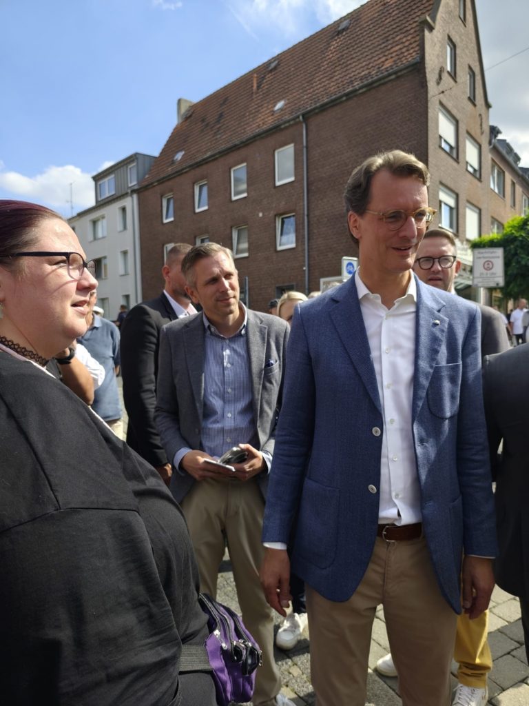 Auf der anderen Straßenseite fand zeitglich eine Infoveranstaltung der CDU-Wesel statt. Diese haben uns auch unterstützt. Vorher schon und am Tag der Demo ist dann jemand rüber und hat direkt jemanden einen Flyer in die Hand gedrückt. Dr.med. Olaf Deling ging auch rüber und kam mit den Worten wieder“ Wenn wir die Trillerpfeifen zur Seite legen, kommt Ministerpräsident Hendrik Wüst, später zu uns. Das haben wir uns nicht zweimal sagen lassen,
